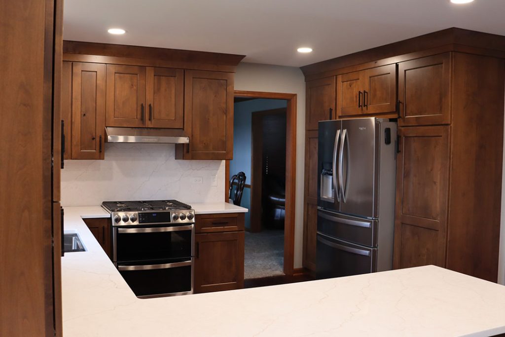 Shiloh Cabinets with rustic wood, heritage door style. Features include slow-close doors and drawers, lazy susan, and appliance garage.