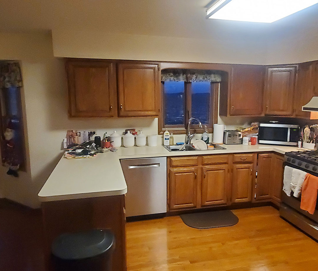 The kitchen saw a major transformation—we eliminated the soffits and outdated light fixtures, replacing them with can lights on dimmers for a clean, contemporary look. We installed Shiloh cabinets, a quartz countertop and backsplash, and an undermount stainless steel sink with awesome accessories like a cutting board, veggie colander, and drying station. We even added a coffee bar and mini fridge for extra functionality!