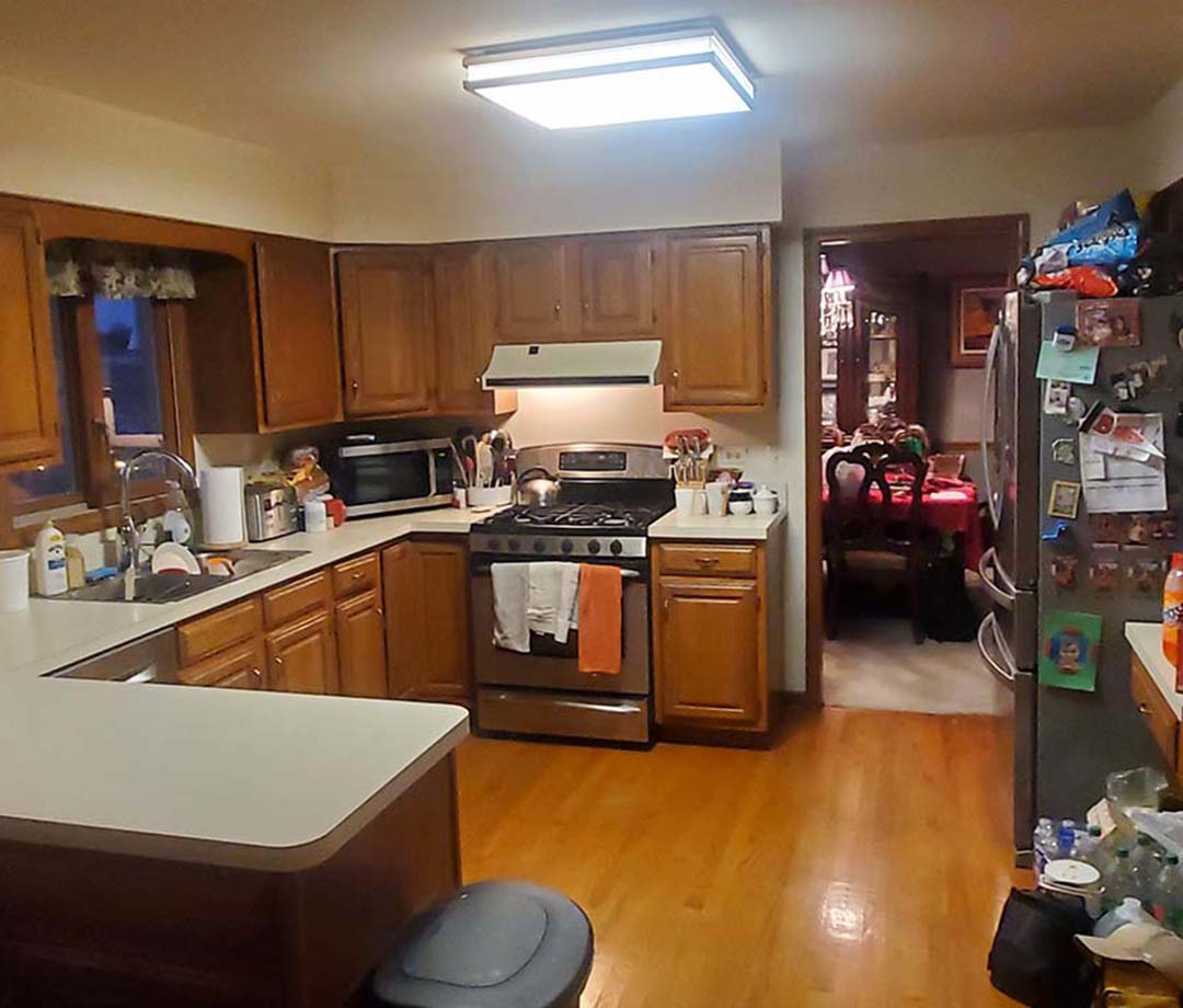 We eliminated the soffits and outdated light fixtures, replacing them with can lights on dimmers for a clean, contemporary look. New stainless steel appliances were installed, including the stove and refrigerator.