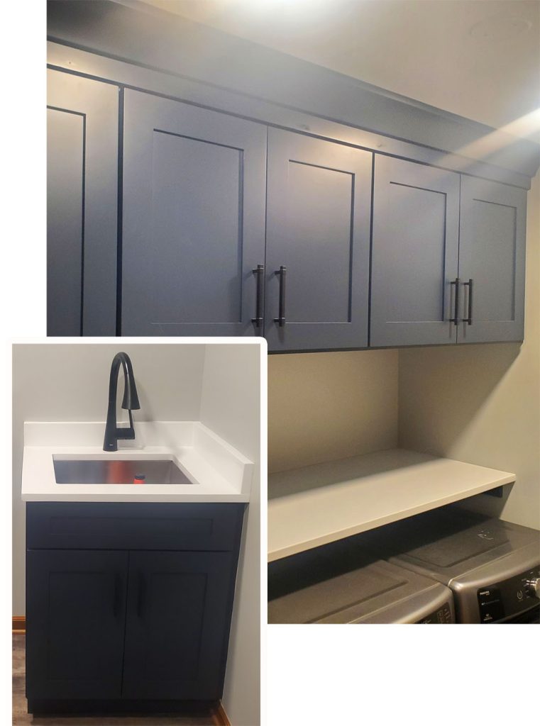 In the laundry room, we went bold with navy blue cabinets, a quartz shelf, and a Grohe sink faucet that combines form and function.